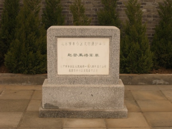 赵登禹墓位于卢沟桥城东关外沙岗村(一文子山)。赵登禹(1898-1937)民国抗日将领。1914年加入冯玉祥的部队,后任冯的随身护兵。1926年参加北伐。1933年,任第29军第37师第108旅旅长。 1933年初,日本侵略军侵袭热河省,攻占了承德后,开始向长城各口发动大举进攻。为消灭敌军,赵登禹利用敌军警戒疏忽,率部从两翼迂回敌人侧后,进行包抄袭击,打得敌人措手不及,死伤甚众。激战数日,敌人多次攻击不果,锐气尽挫,中国军队取得喜峰口战役胜利。1936年1月,授予陆军中将。全面抗战爆发后,7月下旬,数以万计的日军在飞机和坦克的掩护下,分别向北平、天津以及邻近各战略要地大举进攻。担任132师师长的赵登禹,率部抗击日军入侵,守卫北京城外的南苑。部队孤军作战,在敌人炮火和飞机的狂轰滥炸下,损失惨重。赵登禹率部誓死坚守阵地,拼死抗击。7月28日,在奉命向北平撤至退途中,在丰台区大红门处遭到日军伏击,壮烈殉国,牺牲时年仅39岁。遗体曾和二十九军阵亡官兵就地掩埋。抗战胜利后,国民政府发布褒奖令,追赠他为陆军上将,并将遗骨重新安葬于卢沟桥畔。新中国成立后,中央人民政府给其家属颁发了由毛泽东主席签署的烈士证书。赵登禹墓于1980年重建,1984年被公布为区级文物保护单位。 1987年,赵登禹墓被列为“北京市烈士纪念建筑物市级保护单位”。